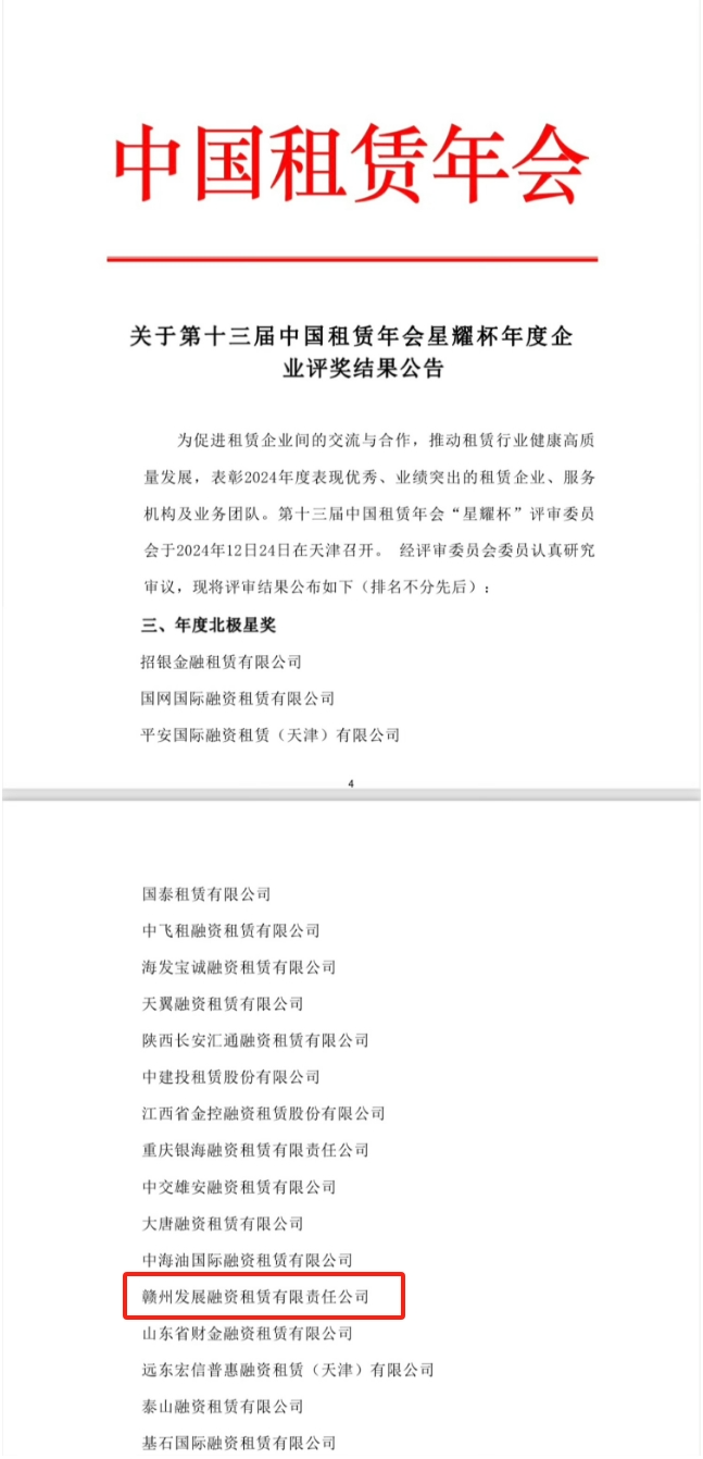 赣州发展融资租赁公司荣获“2024融资租赁行业卓越品...